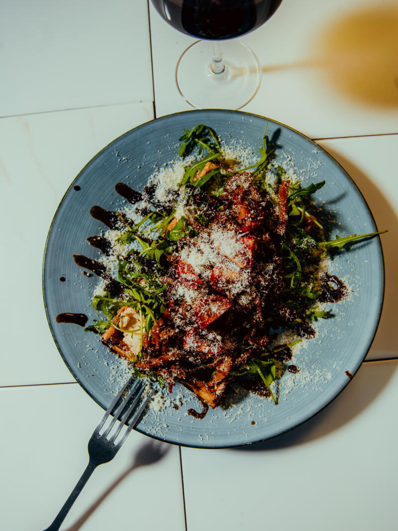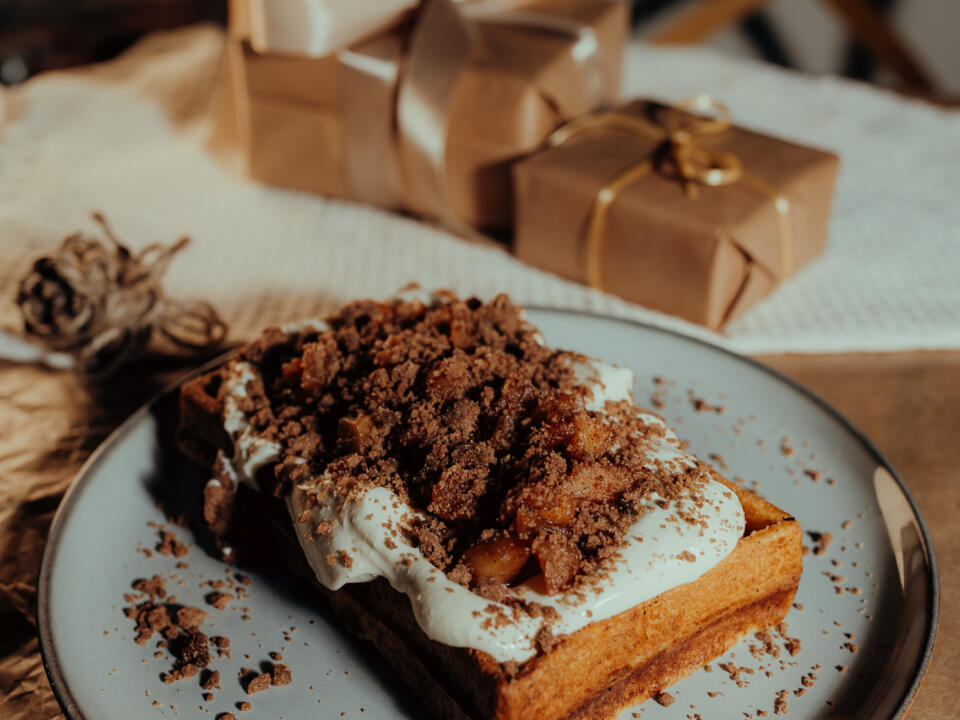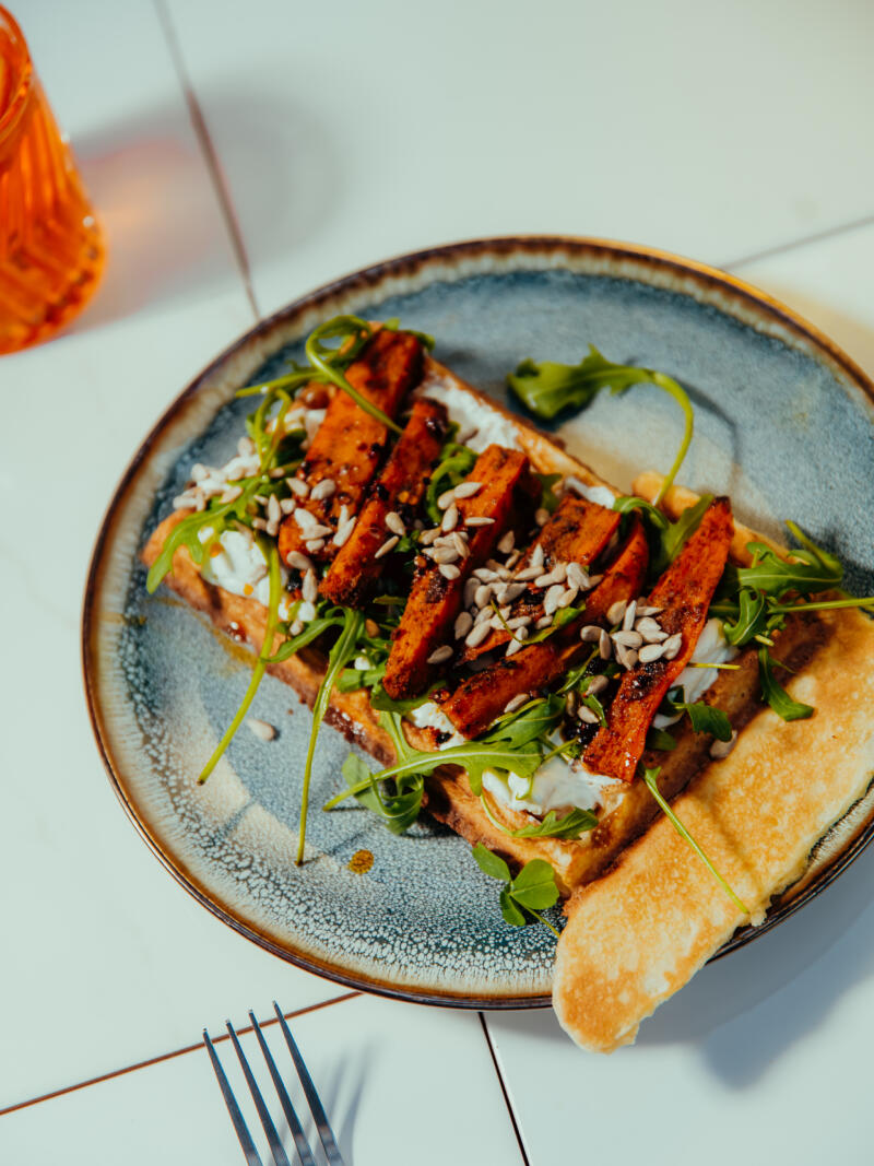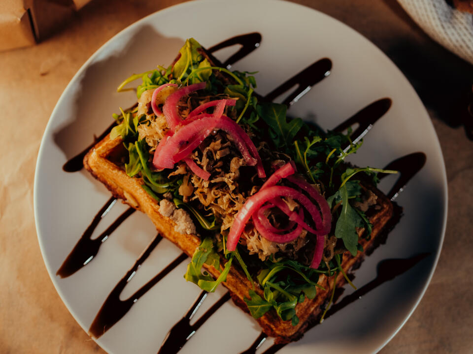 Specjalnością są wegetariańskie gofry na wytrawnie (porcje, którymi można się najeść).