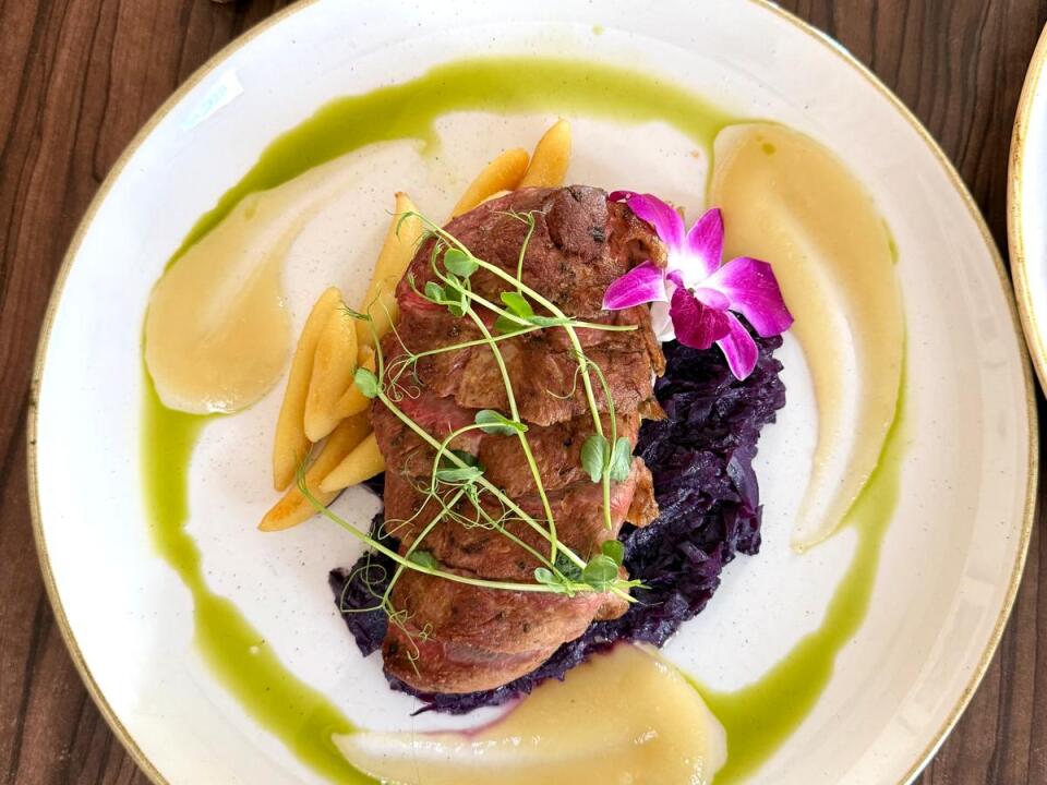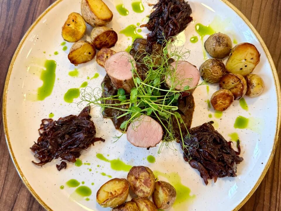 Gebratene Ente mit Birnenmousse, Rotkohl und Schupfnudeln