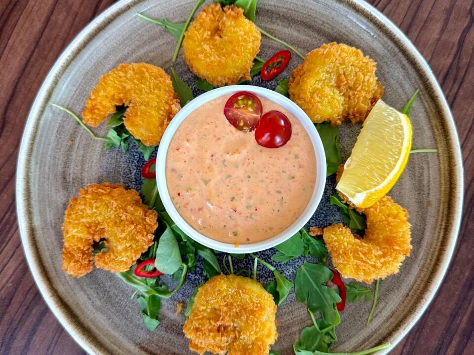 Knusprige Tigergarnelen mit würzigem Knoblauch-Chili-Koriander-Dip