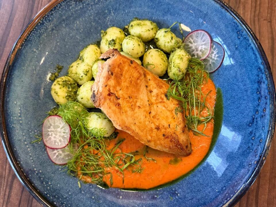 Gegrilltes Hähnchen-Säckchen mit Pilzen, pikanter Paprikasoße und Gnocchi mit Petersilienpesto