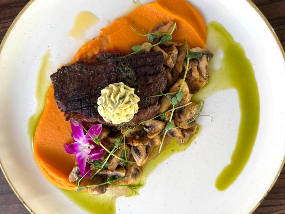 Rumpsteak mit cremigem Süßkartoffelpüree und Champignons in Sahnesoße