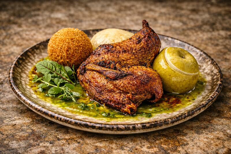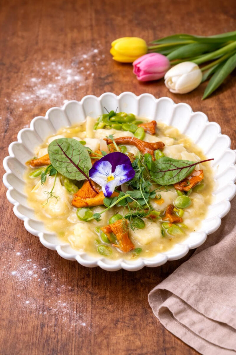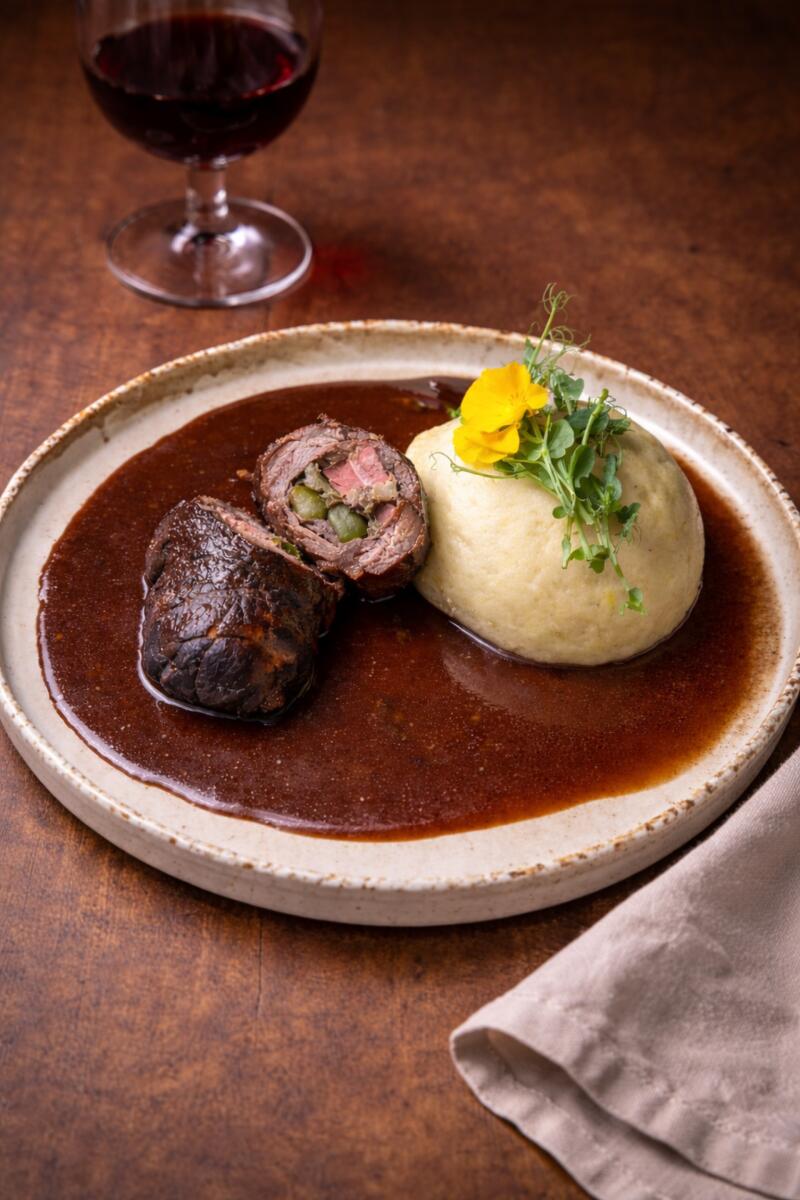 W menu znajdują się własnoręcznie lepione pierogi, tradycyjne dania mięsne, domowy chleb na zakwasie oraz sezonowe desery inspirowane polską kuchnią.