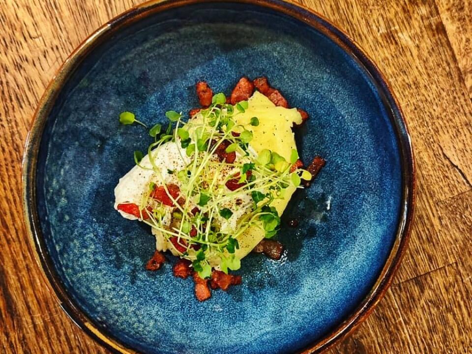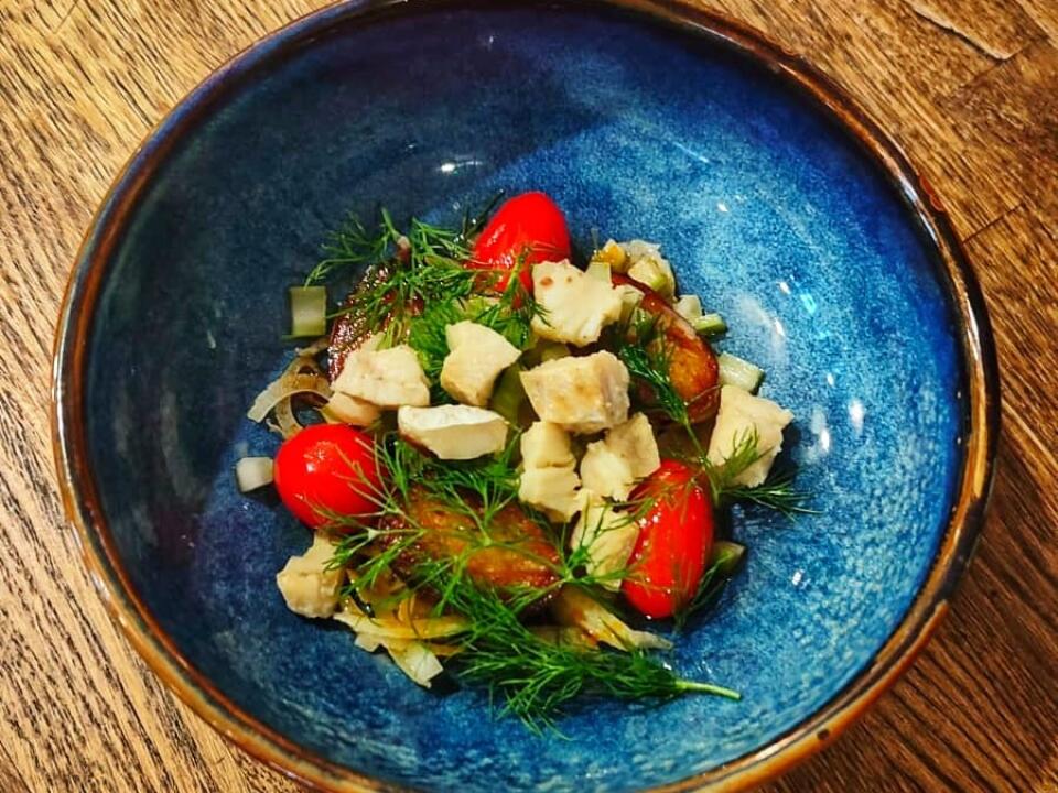 dashi sauce, trout roe, green olive oil