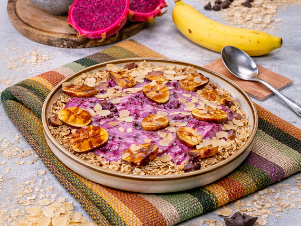 płatki owsiane górskie, mleko bez laktozy, czerwona pitaja, banany, gorzka czekolada,