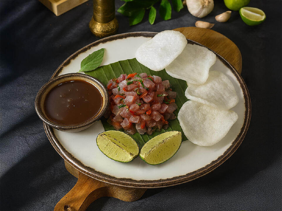 surowy, krojony w kostkę tuńczyk w marynacie Sambal Matah, z dekorem chrupiących listków kemangi,