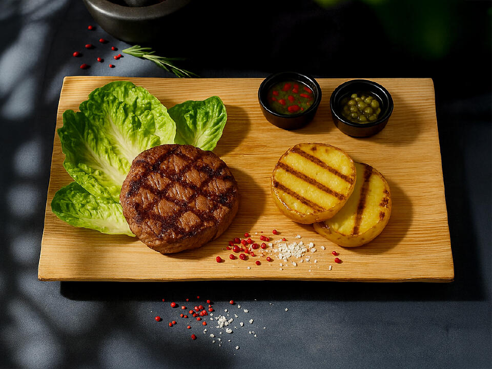 grillowany stek wołowy, sos z zielonym pieprzem oraz chimichurri, ziemniak z grilla,