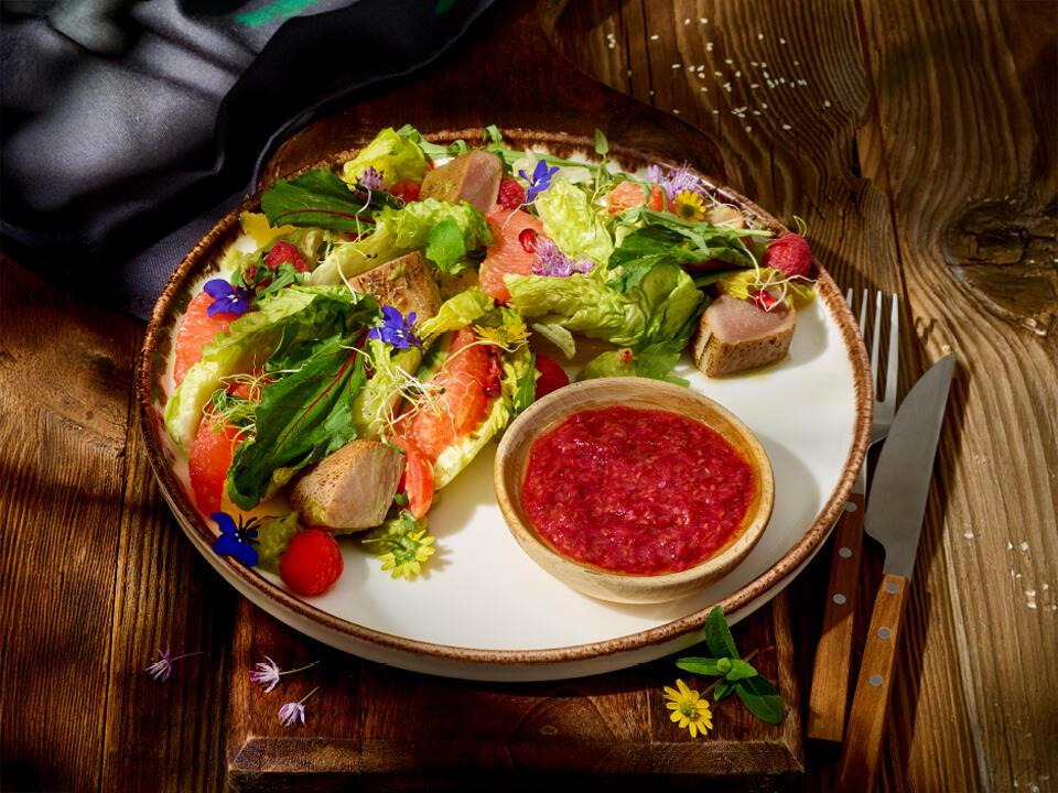 mix sałat, opalany tuńczyk, cytrusy, guacamole, coulis malinowe, piklowane pomidorki cherry / 450 g