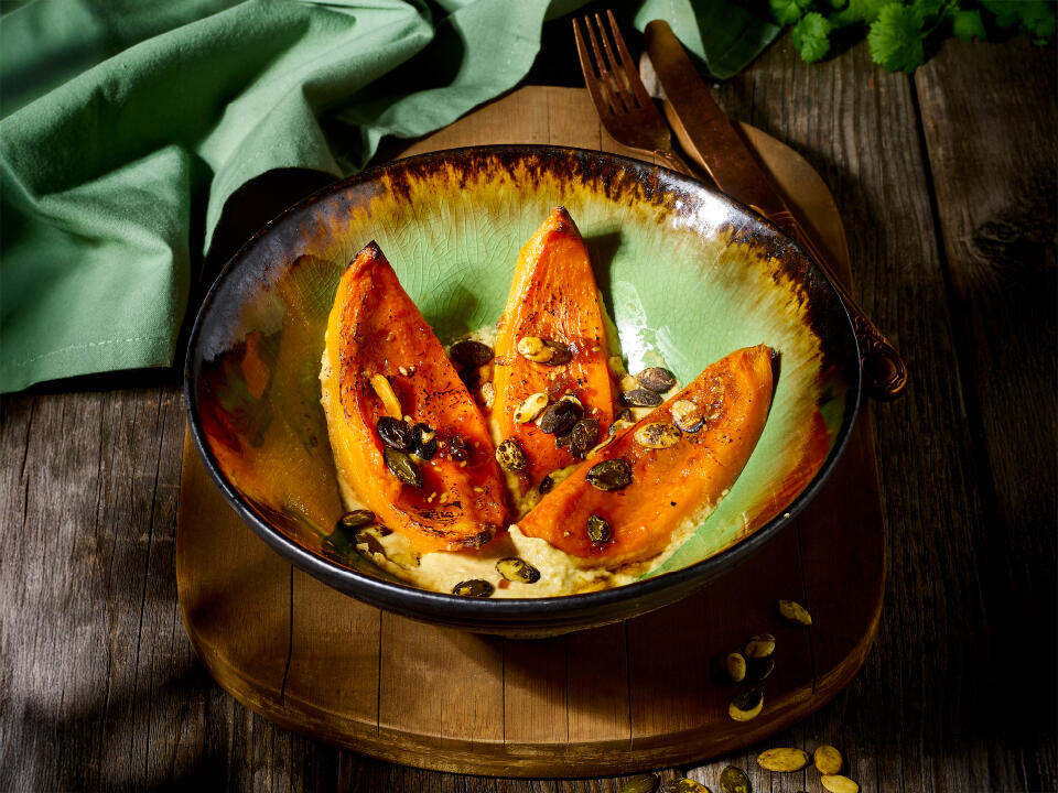 Pieczona i grillowana dynia hokkaido, hummus z palonego kalafiora, prażone pestki dyni, oliwa truflowa,