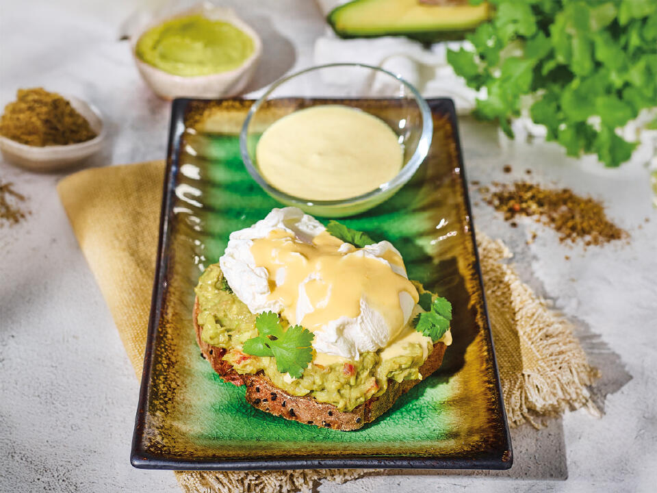 2 eko jajka wiejskie, guacamole, sos holenderski, świeża roszponka, grillowany