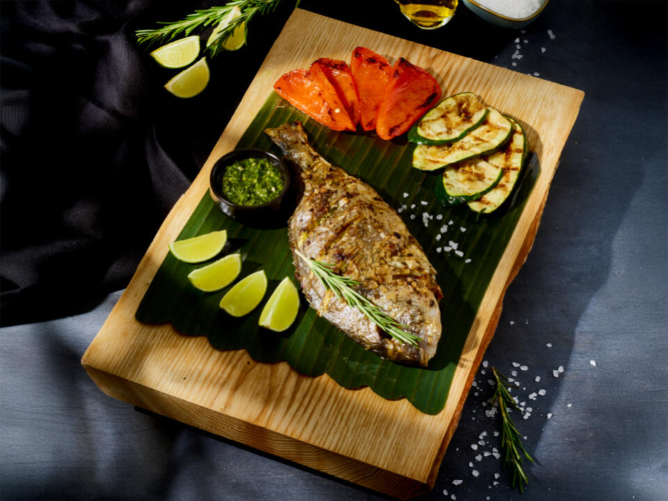 grillowana dorada, zielone pesto, grillowane warzywa, limonka / 710 g