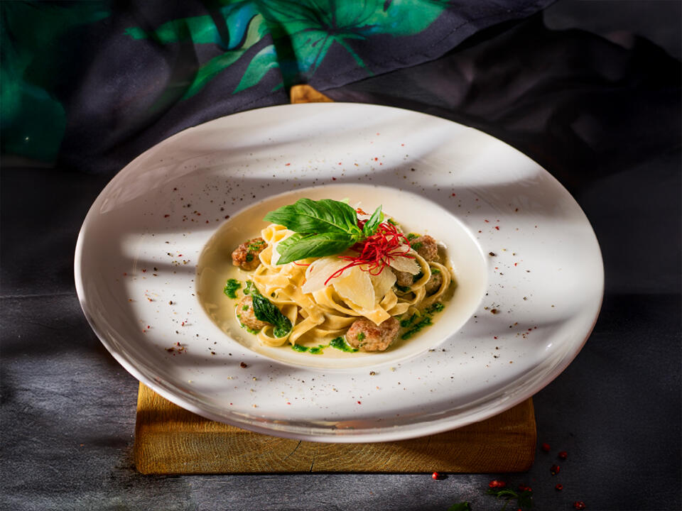 makaron tagiatelle, kiełbasa salsiccia, ser gorgonzola, świeży szpinak, serek mascarpone, ser grana