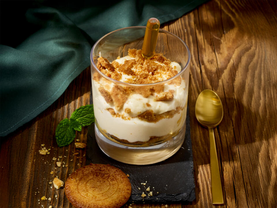 francuska odpowiedź na włoskie Tiramisu, na bazie kruchych ciasteczek maślanych, serka mascarpone, kremu z solonego karmelu oraz francuskiego koniaku Calvados
