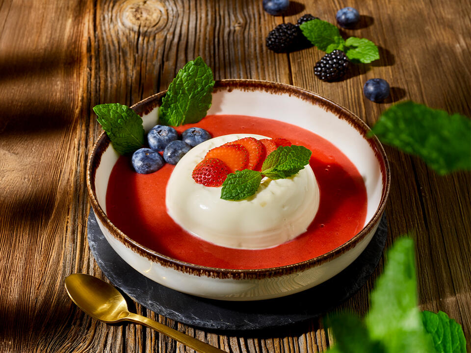 oryginalny włoski deser na bazie śmietanki kremowej, musu ze świeżych truskawek i świeżej mięty