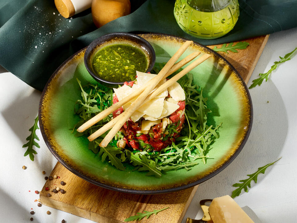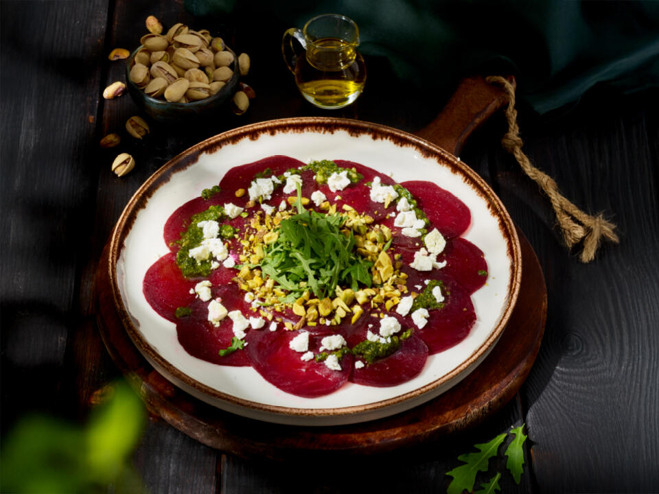 gotowany burak marynowany w oliwie i czosnku, ser kozi, zielone pesto, rukola, prażone orzechy pistacji, oliwa