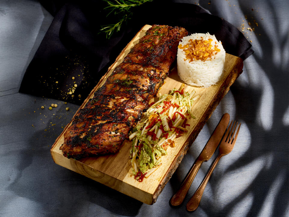 pieczone żeberka wieprzowe w marynacie sosu teriyaki, orzechów nerkowca i natki pietruszki, ryż jaśminowy, surówka