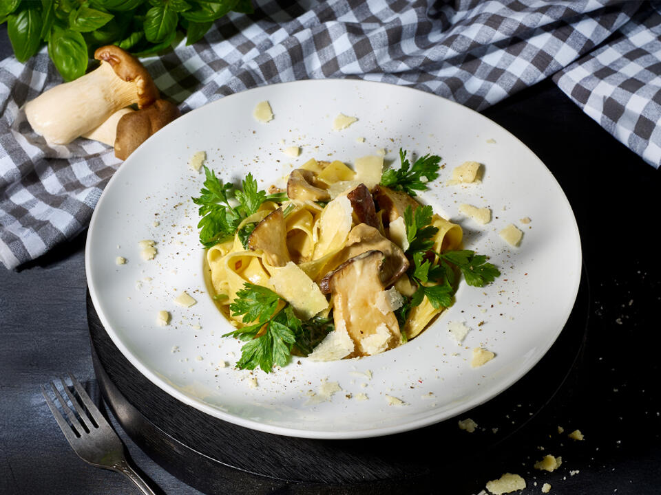 makaron tagliatelle , prawdziwki, świeży szpinak, czosnek, ser grana padano, sos na bazie