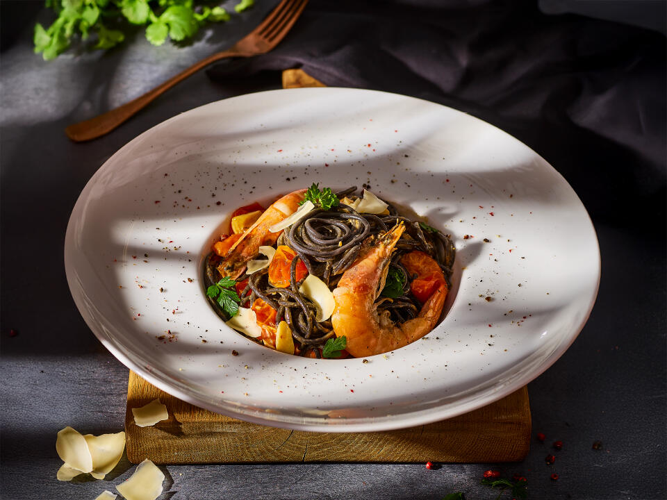 czarny makaron spaghetti z sepią, krewetki, pomidorki koktajlowe, crème fraiche, ser grana padano,