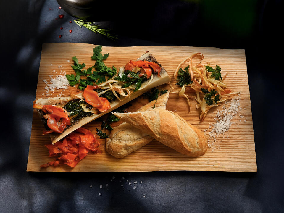 kość wołowa szpikowa, zielone domowe pesto czosnkowo - pietruszkowe, chipsy z pietruszki, chipsy z marchewki,