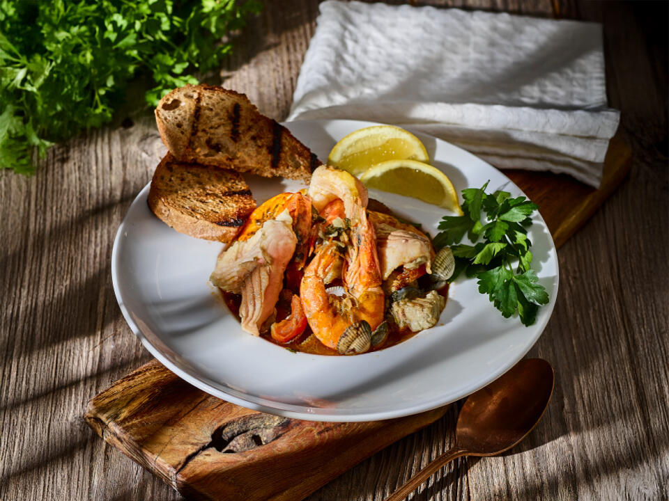 dorsz, krewetki, mule, kalmary, pomidory, czosnek, papryczka chilli, natka pietruszki,