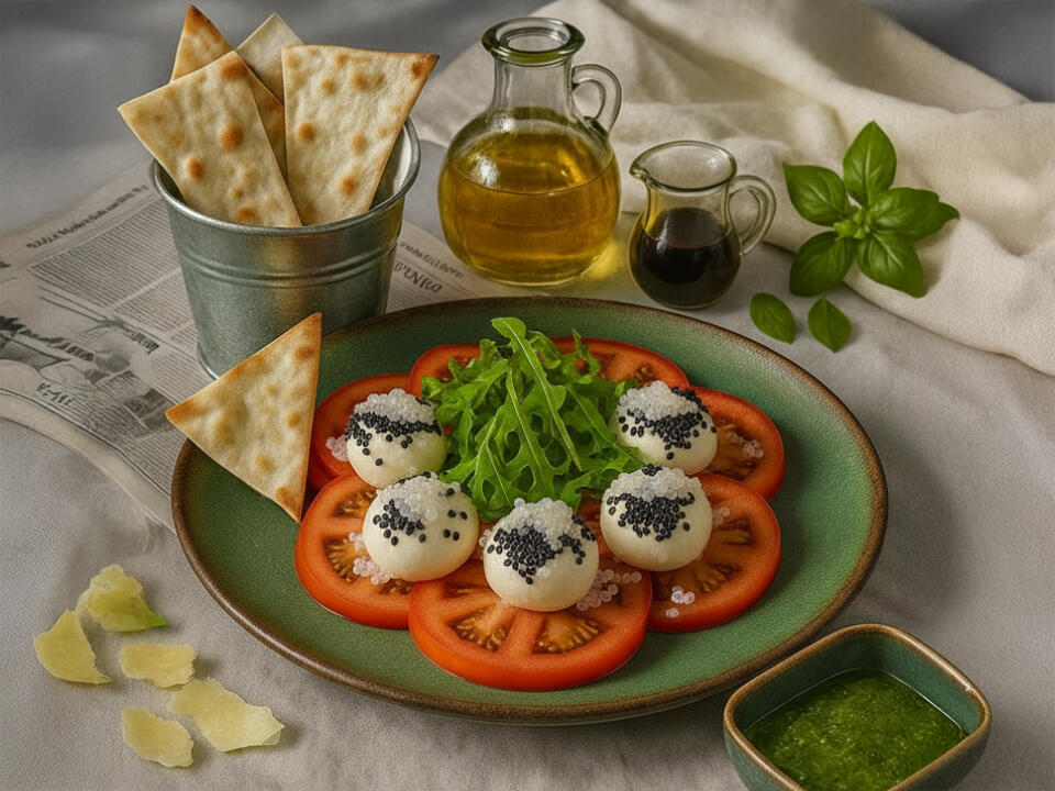 pomidory, rukola, serek śmietankowy, kawior ze śledzia, focaccia, oliwa cytrynowa / 390 g