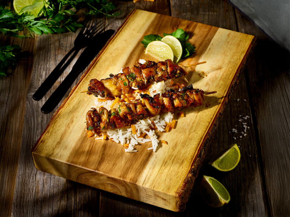 szaszłyki z boczniaka w marynacie z sosu teriyaki, natki pietruszki oraz orzechów pekan, ryż jaśminowy,
