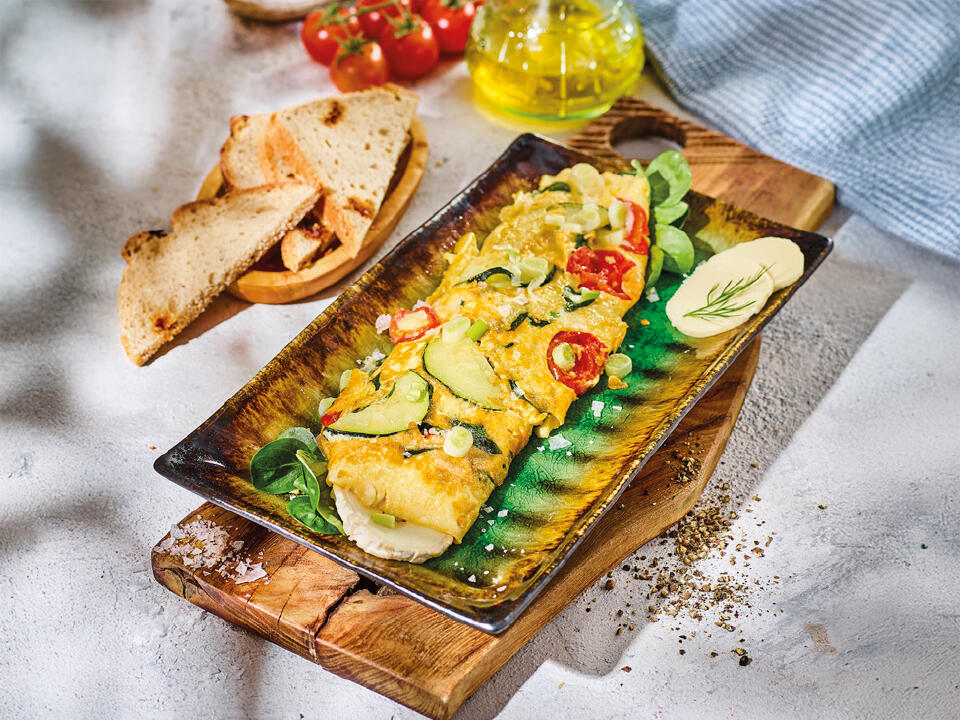 Omlet z kozim serem i sezonowymi warzywami