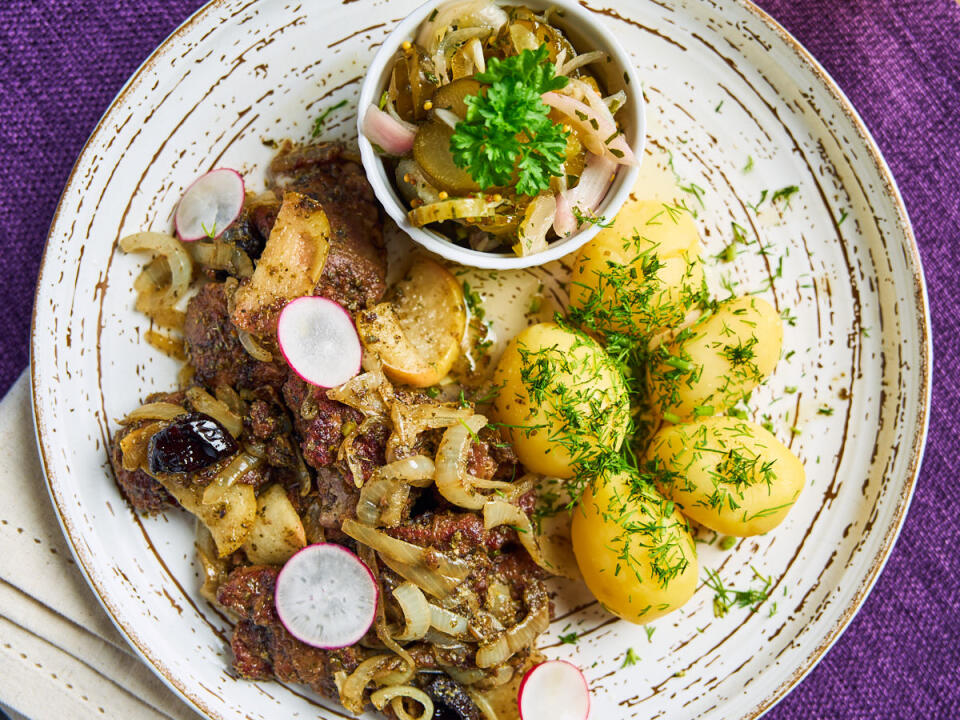Zamówiliśmy zrazy z kluskami i buraczkami. Wszystko było bardzo smaczne