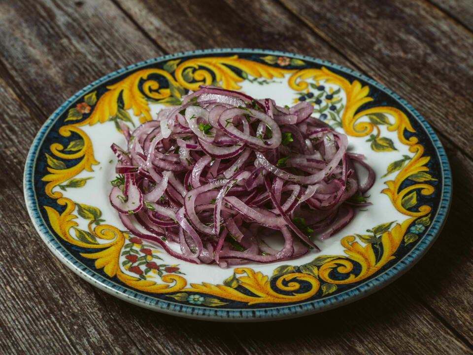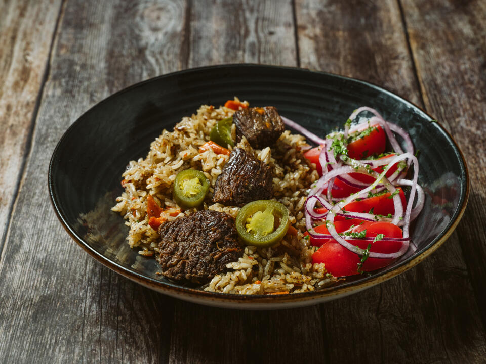 garlic, onion, barberry and spices. It differs from Christmas plov in its darker color and more