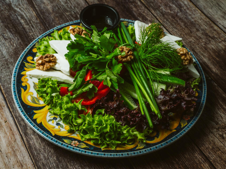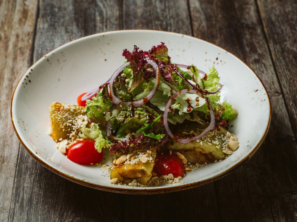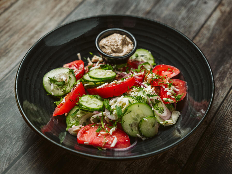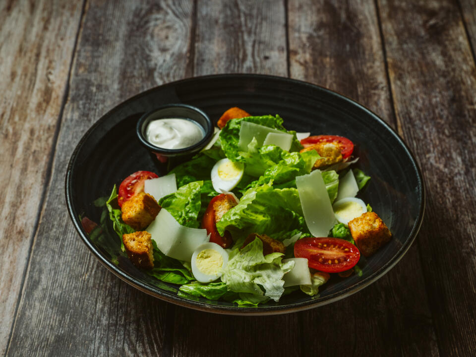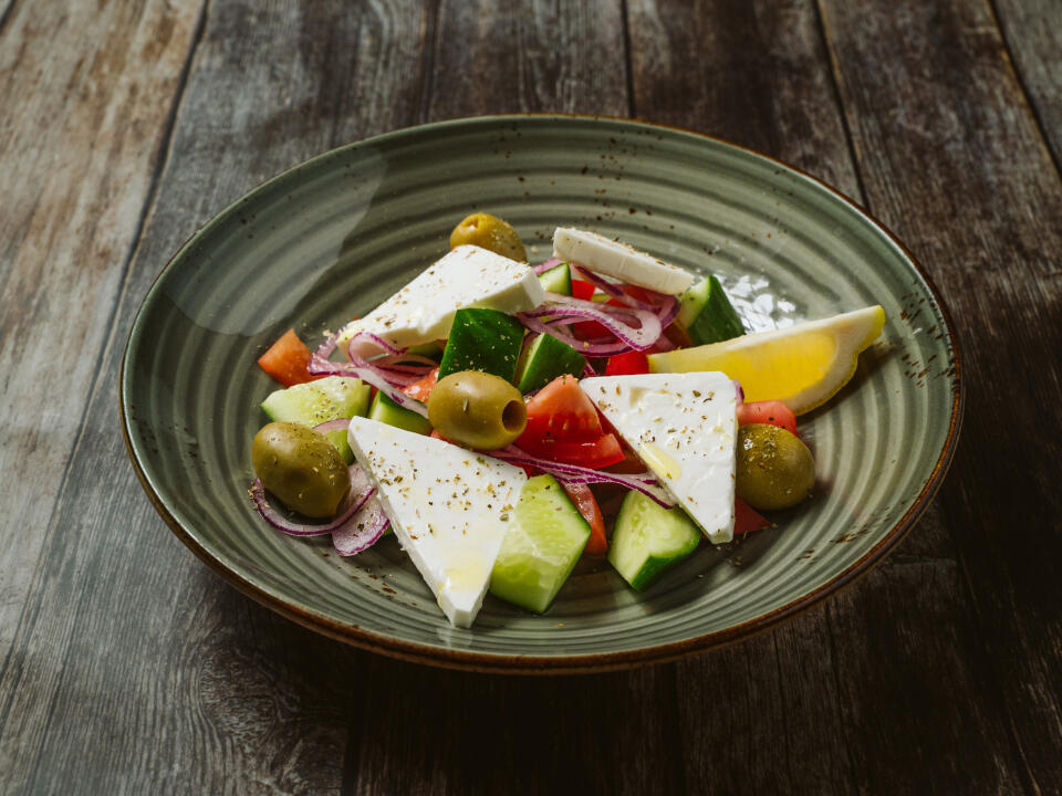 EN – Crispy lettuce, red bell-pepper, cucumber, cherry tomato, olives, onion, and cheese seasoned with mustard and nut sauce.