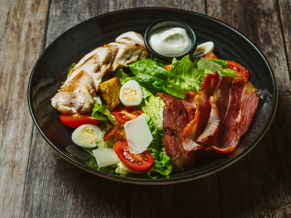 RU – Листья салата, паприка, огурец, помидор черри, оливки и лук, сыр, заправленные горчично-медовым соусом.