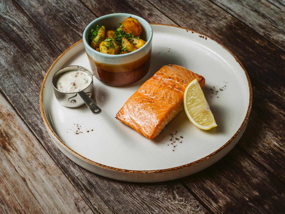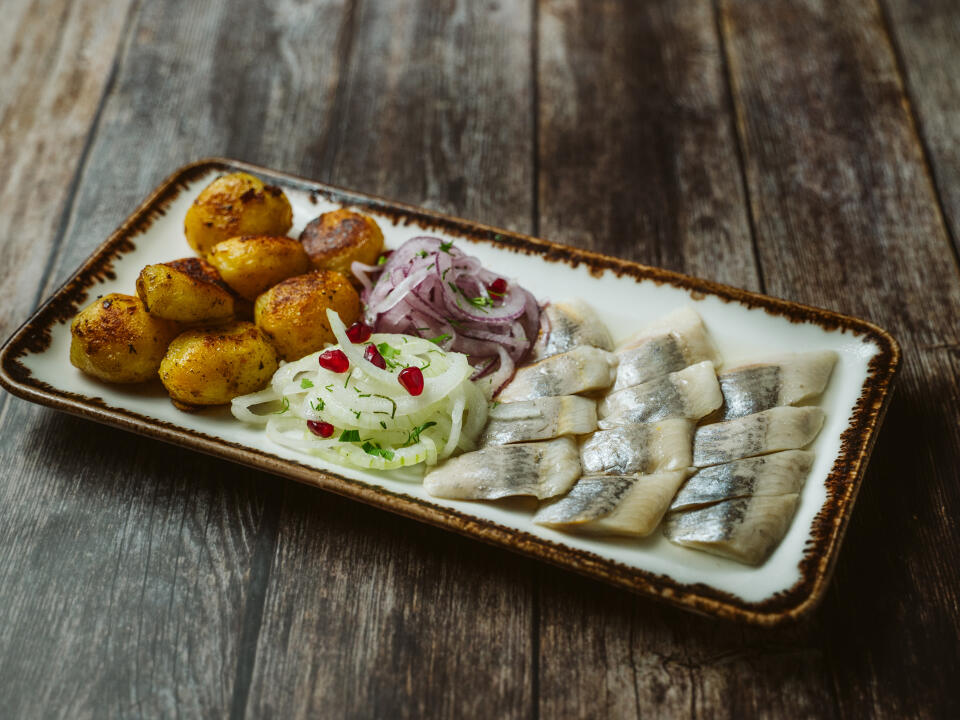 Served with roasted potatoes and pickles in a delicate honey marinade.