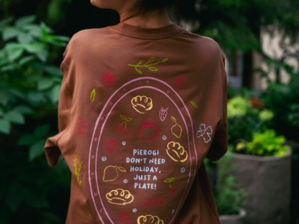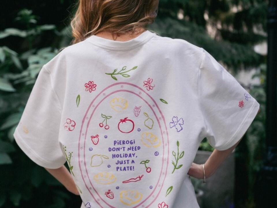 Na plecach - pełna detali grafika przedstawiająca pierogi w towarzystwie sezonowych warzyw i owoców. Na przodzie – subtelna, urocza ilustracja pieroga, który przypomina, że życie smakuje najlepiej, gdy dzielimy się dobrym jedzeniem.
