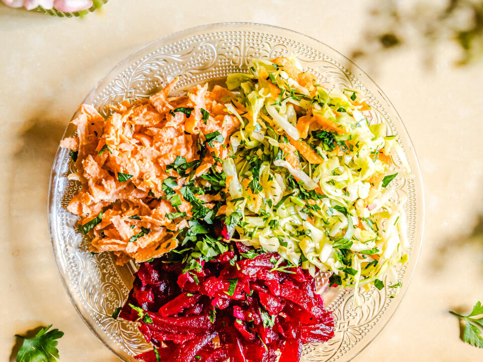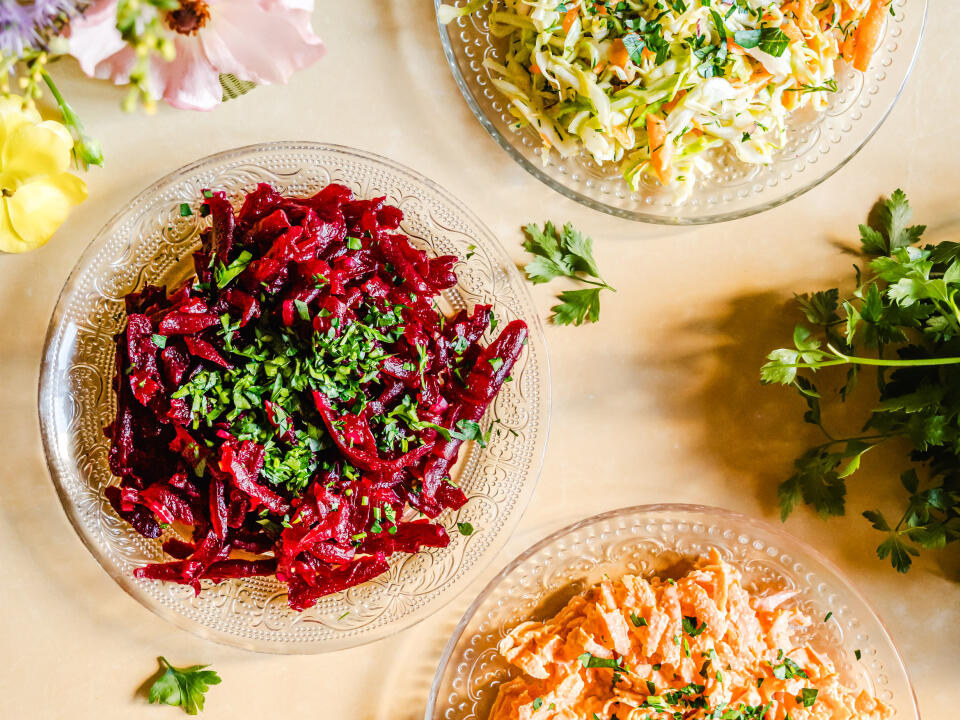 -grated beetroot with red onion and raspberry sauce
