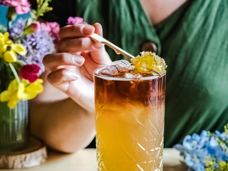 base, espresso, ice, slice of honey.