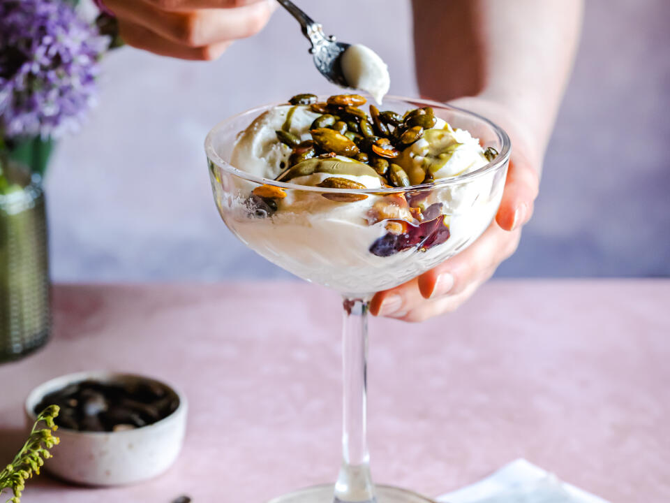 with crispy pumpkin seeds.