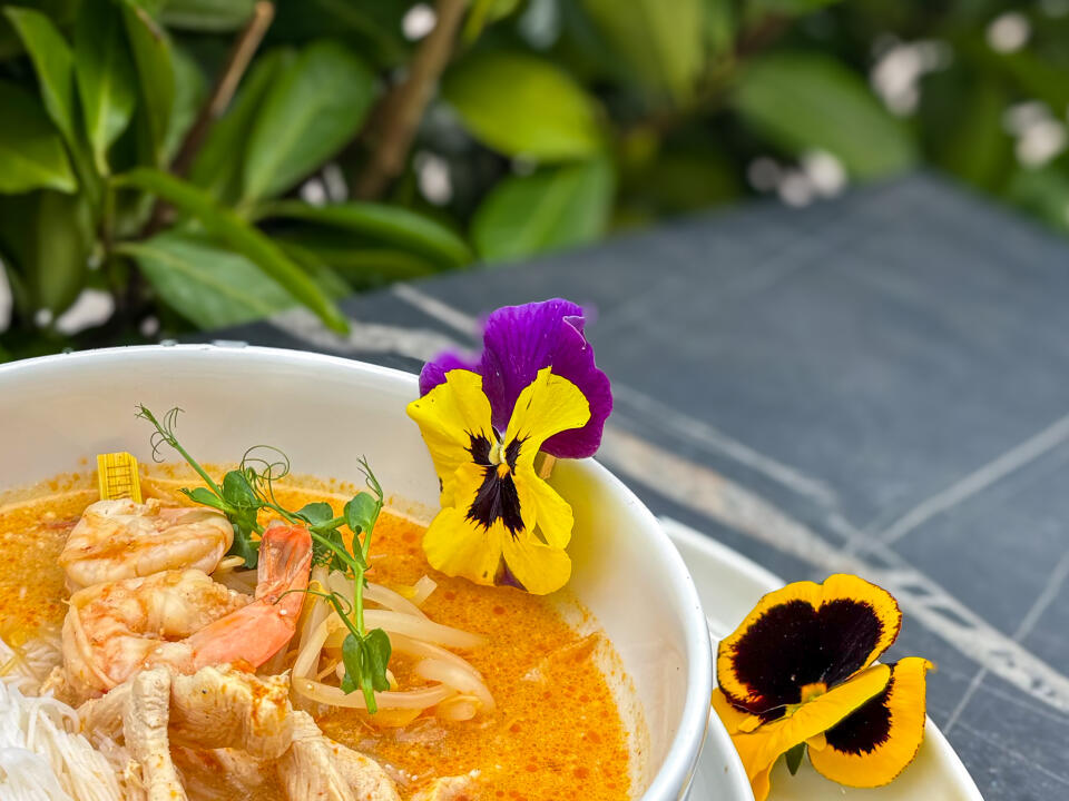 i krewetkami, makaronem ryżowym, fasolą mung i pikantną oliwą chilli.