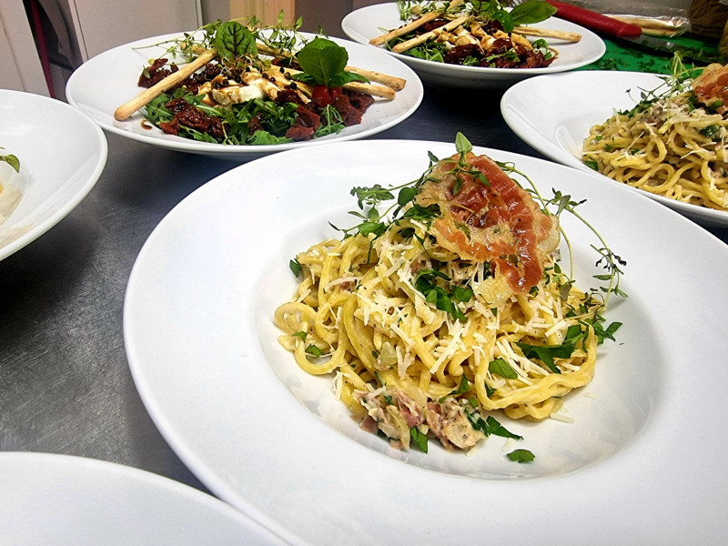 Jedzenie pyszne, świeże. Zamówiliśmy dwa makarony i pizzę, od pizzy oczekiwaliśmy czegoś innego, typowej pizzy neapolitańskiej, jednak się nie zawiedliśmy. Pyszna chrupiąca i dość sporych rozmiarów!! Wszystko było dobrze doprawione. Obsługa też przemiła!! Zdecydowanie miejsce godne polecenia :)